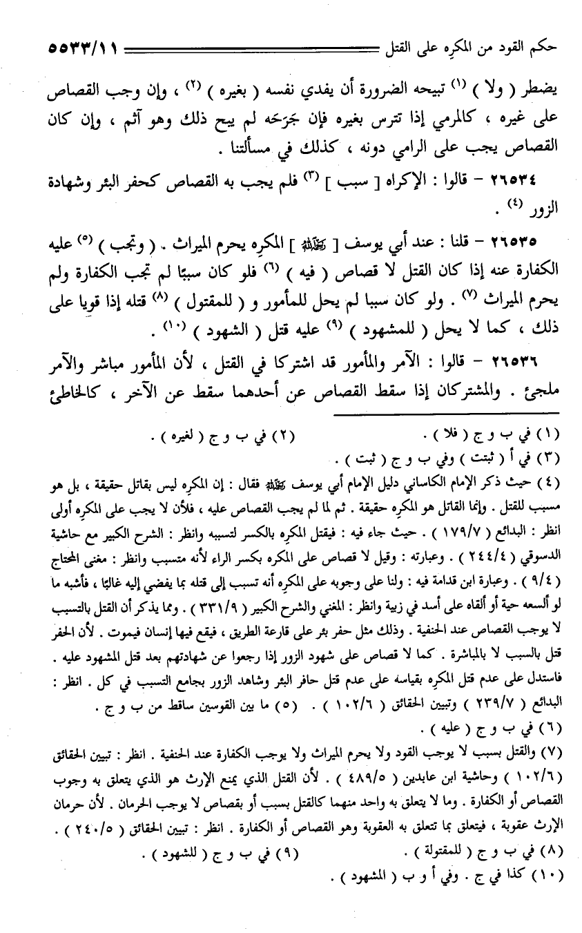 26535 - قلنا: عند أبي يوسف [رحمه الله] المكره يحرم الميراث. (وتجب) عليه الكفارة عنه إذا كان القتل لا قصاص (فيه) فلو كان سببًا لم تجب الكفارة ولم يحرم الميراث. ولو كان سببًا لم يحل للمأمور و (للمقتول) قتله إذا قويا على ذلك، كما لا يحل (للمشهود) عليه قتل الشهود).