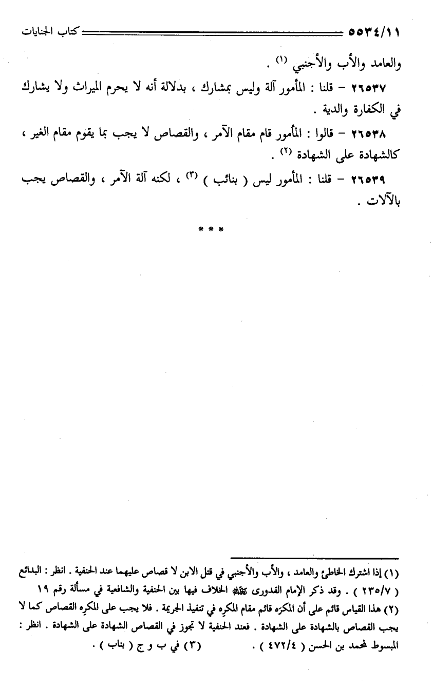 26537 - قلنا: المأمور آلة وليس بمشارك، بدلالة أنه لا يحرم الميراث ولا يشارك في الكفارة والدية.