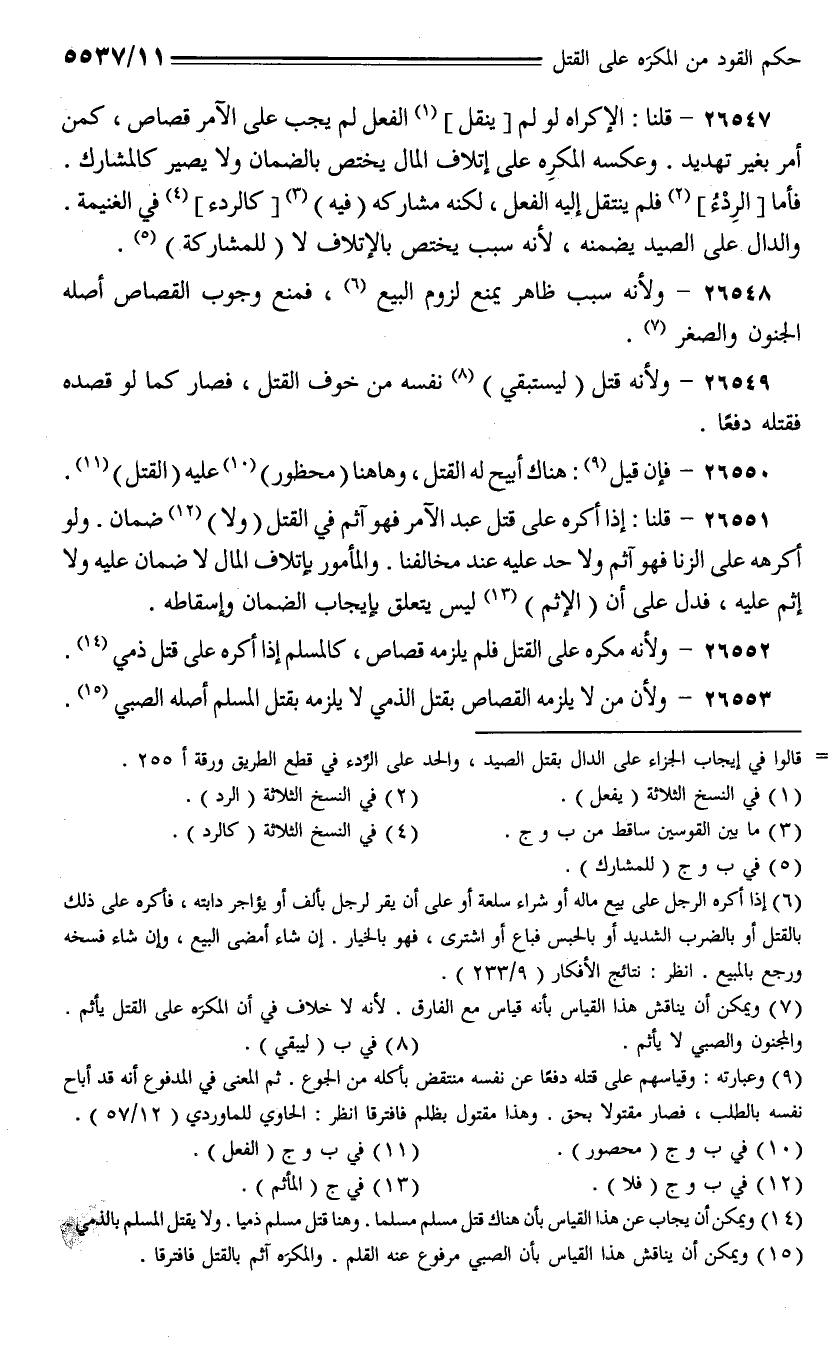 26547 - قلنا: الإكراه لو لم [ينقل] الفعل لم يجب على الآمر قصاص، كمن أمر بغير تهديد. وعكسه المكره على إتلاف المال يختص بالضمان ولا يصير كالمشارك. فأما [الردء] فلم ينتقل إليه الفعل، لكنه مشاركه (فيه) [كالردء] في الغنيمة. والدال على الصيد يضمنه، لأنه سبب يختص بالإتلاف لا (للمشاركة).