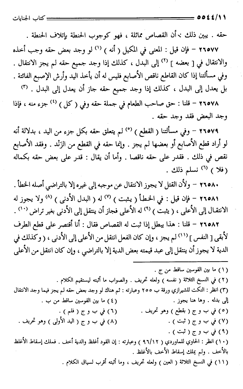 26582 - قلنا: هذا يبطل إذا ثبت له القصاص فقال: أنا أقتصر على قطع الطرف لأبقى [النفس] لم يجز، وإن كان الفعل انتقل من الأعلى إلى الأدنى، (وكذلك في الدية لا يجوز أن ينتقل إلى عبد قيمته بعض الدية إلا بالتراضي، وإن كان انتقل من الأعلى
