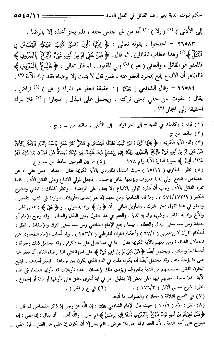 26583 - احتجوا: بقوله تعالى: {يأيها الذين امنوا كتب عليكم القصاص في القتلى} وهذا خطاب للقاتلين. ثم قال: {فمن عفى له من أخيه شيء فاتباع بالمعروف} فالمعفو هو القاتل، والعافي (هو) ولي المقتول. ثم قال تعالى: {فاتباع بالمعروف} فالظاهر أن الاتباع يقع بمجرد العفو عنه، فمن قال لا يثبت إلا برضاه فقد ترك الآية.