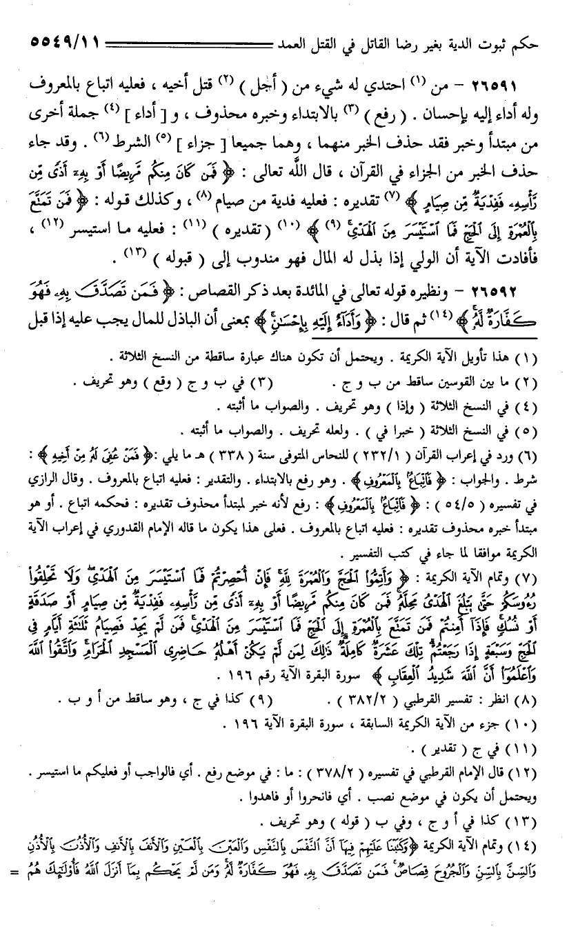 26591 - من احتدي له شيء من (أجل) قتل أخيه، فعليه إتباع بالمعروف وله أداء إليه بإحسان. (رفع) بالابتداء وخبره محذوف، و [أداء] جملة أخرى من مبتدأ وخبر فقد حذف الخبر منهما، وهما جميعا [جزاء] الشرط. وقد جاء حذف الخبر من الجزاء في القرآن، قال الله تعالى: {فمن كان منكم مريضًا أو به أذى من رأسه ففدية من صيام} تقديره: فعليه فدية من صيام، وكذلك قوله: {فمن تمتع بالعمرة إلى الحج فما استيسر من الهدى} (تقديره): فعليه ما استيسر، فأفادت الآية أن الولي إذا بذل له المال فهو مندوب إلى (قبوله).