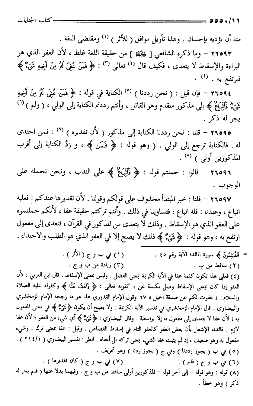 26593 - وما ذكره الشافعي [رحمه الله] من حقيقة اللغة غلط، لأن العفو الذي هو البراءة والإسقاط، لا يتعدى، فكيف قال تعالى: {فمن عفى له من أخيه شيء} فيرتفع به.