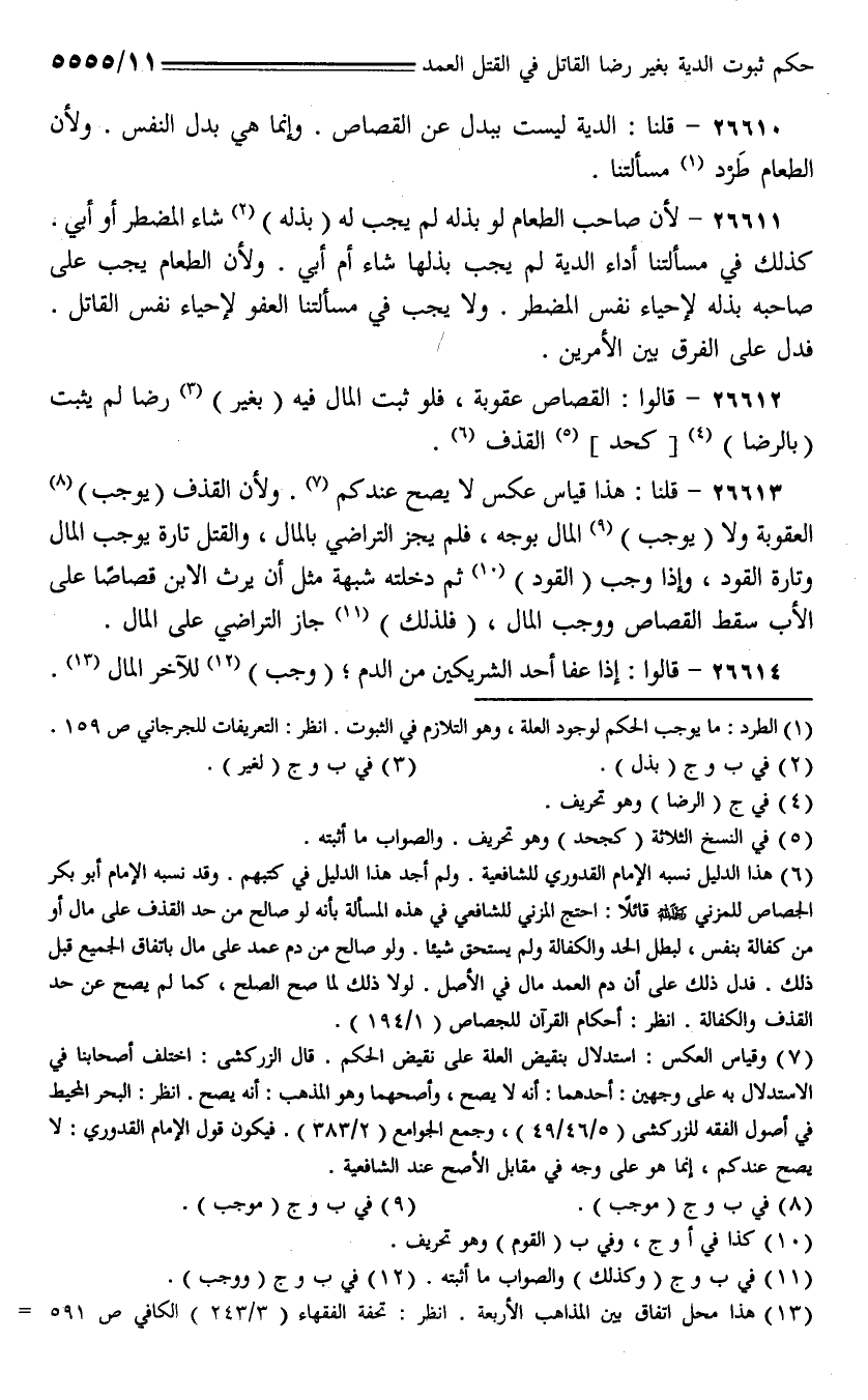26612 - قالوا: القصاص عقوبة، فلو ثبت المال فيه (بغير) رضا لم يثبت (بالرضا) [كحد] القذف.