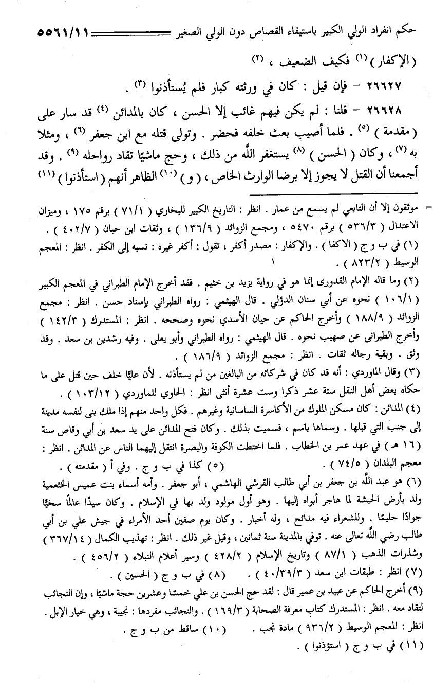 26628 - قلنا: لم يكن فيهم غائب إلا الحسن، كان بالمدائن قد سار على (مقدمة). فلما أصيب بعث خلفه فحضر. وتولى قتله مع ابن جعفر، ومثلا به، وكان (الحسن) يستغفر الله من ذلك، وحج ماشيًا تقاد رواحله. وقد أجمعنا أن القتل لا يجوز إلا برضا الوارث الخاص، (و) الظاهر أنهم (استأذنوا)