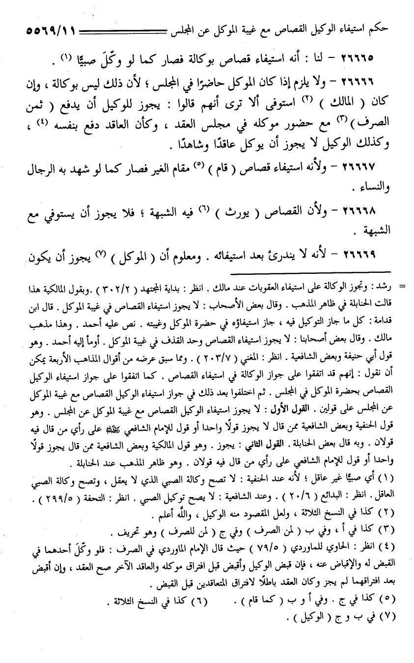 26666 - ولا يلزم إذا كان الموكل حاضرًا في المجلس؛ لأن ذلك ليس بوكالة، وإن كان (المالك) استوفى ألا ترى أنهم قالوا: يجوز للوكيل أن يدفع (ثمن الصرف) مع حضور موكله في مجلس العقد، وكأن العاقد دفع بنفسه، وكذلك الوكيل لا يجوز أن يوكل عاقدًا وشاهدًا.