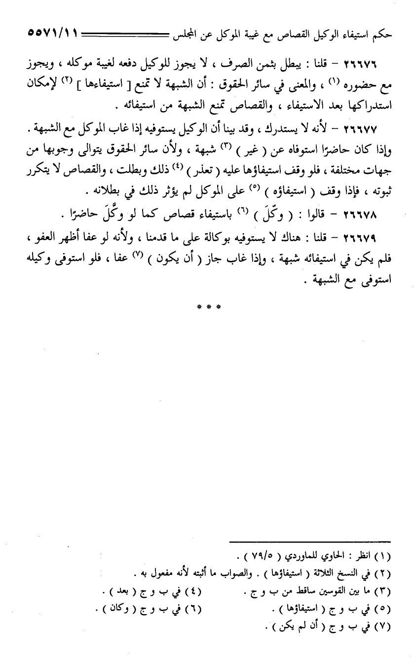 26676 - قلنا: يبطل بثمن الصرف، لا يجوز للوكيل دفعه لغيبة موكله، ويجوز مع حضوره، والمعنى في سائر الحقوق: أن الشبهة لا تمنع [استيفاءها] لإمكان استدراكها بعد الاستيفاء، والقصاص تمنع الشبهة من استيفائه.