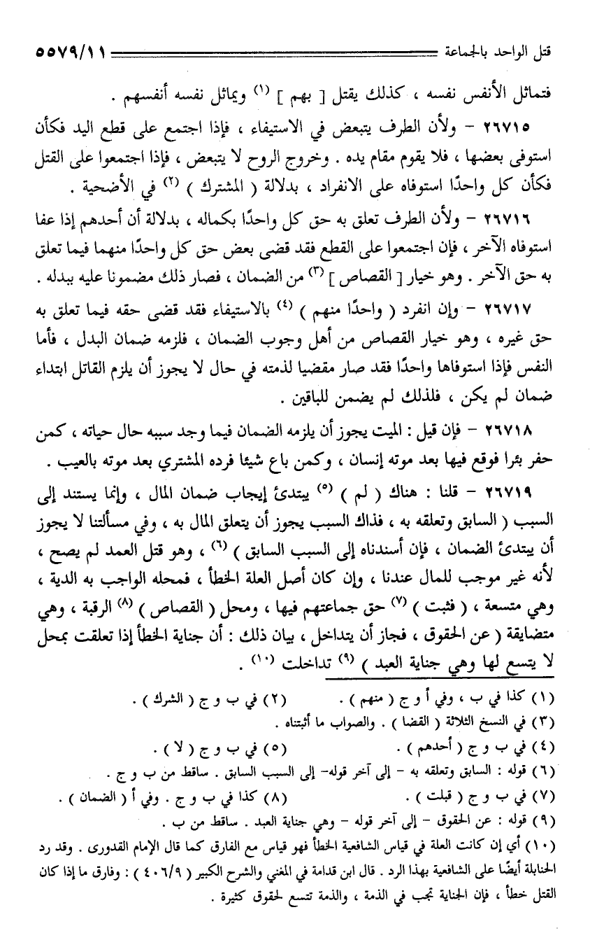 26717 - وإن انفرد (واحدًا منهم) بالاستيفاء فقد قضى حقه فيما تعلق به حق غيره، وهو خيار القصاص من أهل وجوب الضمان، فلزمه ضمان البدل، فأما النفس فإذا استوفاها واحدًا فقد صار مقضيا لذمته في حال لا يجوز أن يلزم القاتل ابتداء ضمان لم يكن، فلذلك لم يضمن للباقين.