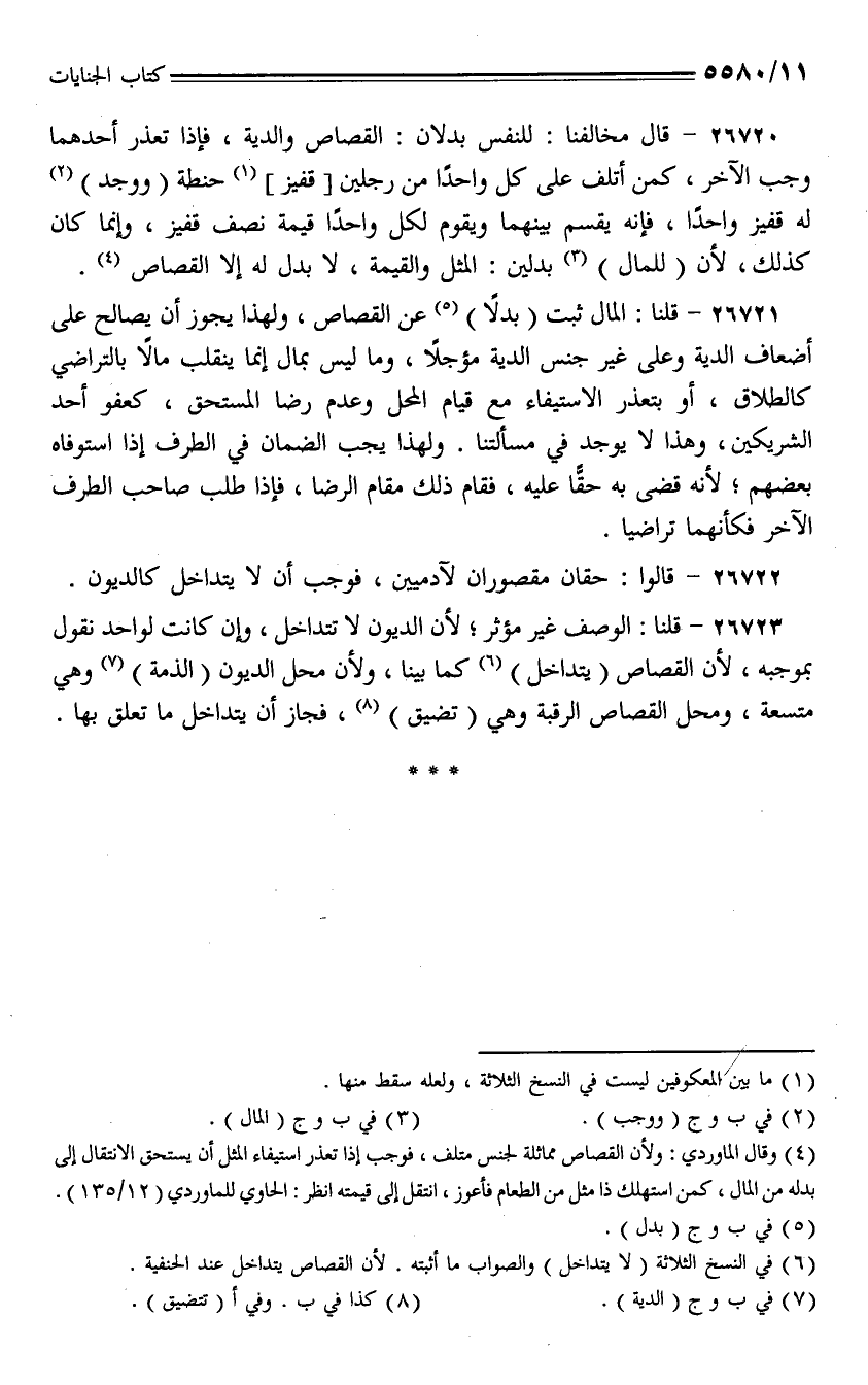 26720 - قال مخالفنا: للنفس بدلان: القصاص والدية، فإذا تعذر أحدهما وجب الآخر، كمن أتلف على كل واحدًا من رجلين [قفيز] حنطة (ووجد) له قفيز واحدًا، فإنه يقسم بينهما ويقوم لكل واحدًا قيمة نصف قفيز، وإنما كان كذلك، لأن، (للمال) بدلين: المثل والقيمة، لا بدل له إلا القصاص.