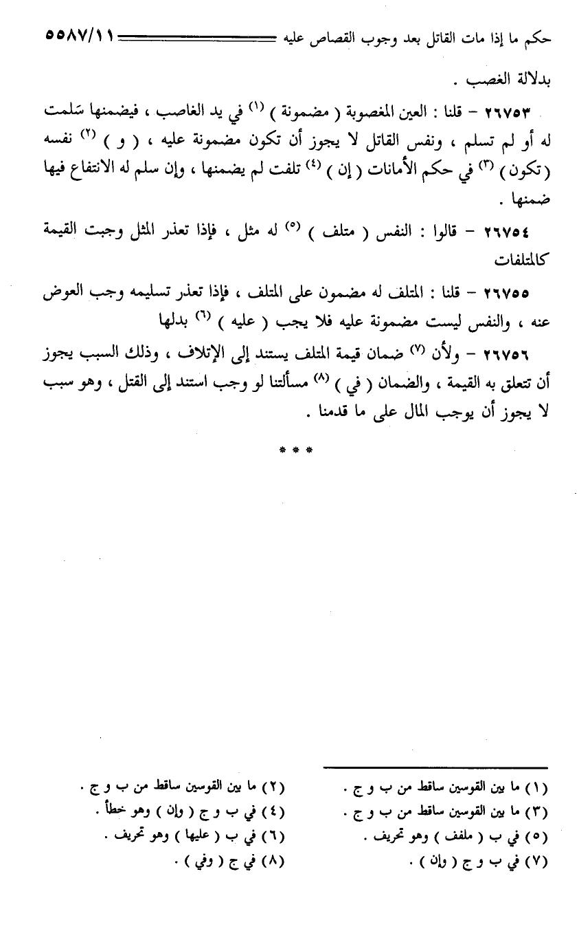 26753 - قلنا: العين المغصوبة (مضمونة) في يد الغاصب، فيضمنها سلمت له أو لم تسلم، ونفس القاتل لا يجوز أن تكون مضمونة عليه، (و) نفسه (تكون) في حكم الأمانات (إن) تلفت لم يضمنها، وإن سلم له الانتفاع فيها ضمنها.