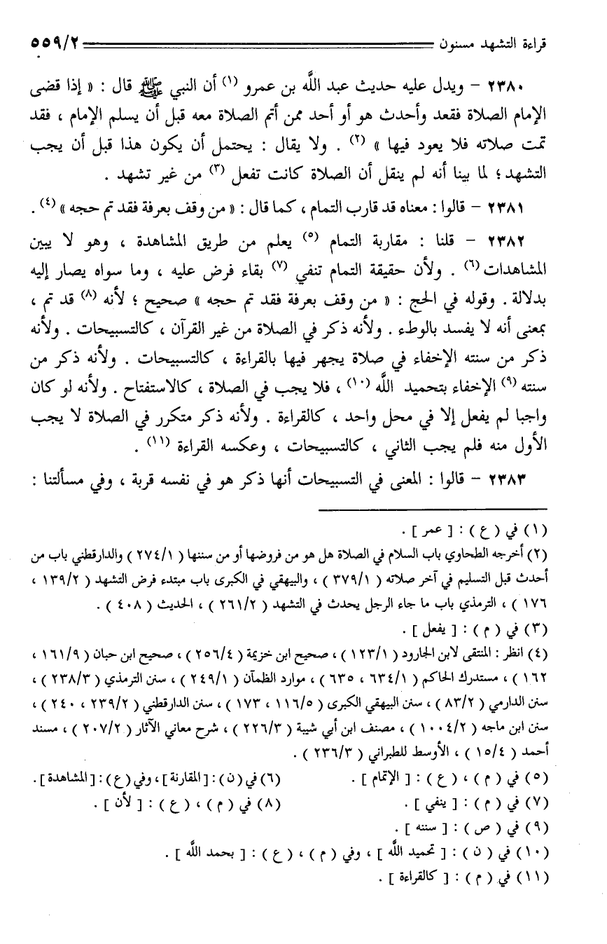 2380 - ويدل عليه حديث علد الله بن عمرو أن النبي - صلى الله عليه وسلم - قال: (إذا قضى الإمام الصلاة فقعد وأحدث هو أو أحد ممن أتم الصلاة معه قبل أن يسلم الإمام، فقد تمت صلاته فلا يعود فيها). ولا يقال: يحتمل أن يكون هذا قبل أن يجب التشهد؛ لم بينا أنه لم ينقل أن الصلاة كانت تفعل من غير تشهد.
