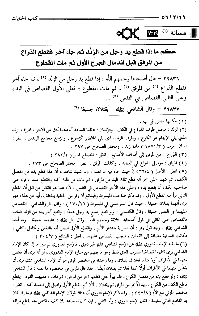 26836 - قال أصحابنا رحمهم الله: إذا قطع يد رجل من الزند، ثم جاء آخر فقطع الذراع من المرفق، ثم مات المقطوع؛ فعلى الأول القصاص في اليد، وعلى الثاني القصاص في النفس.