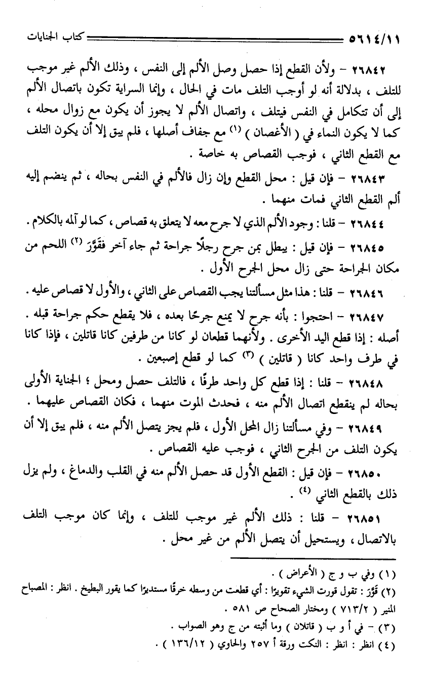 26844 - قلنا: وجود الألم الذي لا جرح معه لا يتعلق به قصاص، كما لو آلمه بالكلام.