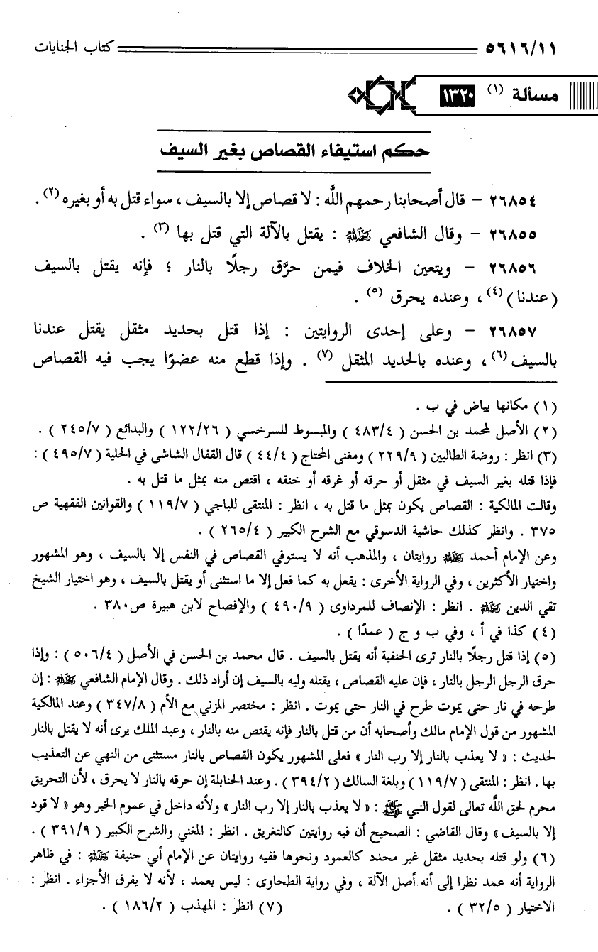 26854 - قال أصحابنا رحمهم الله: لا قصاص إلا بالسيف، سواء قتل به أو بغيره.