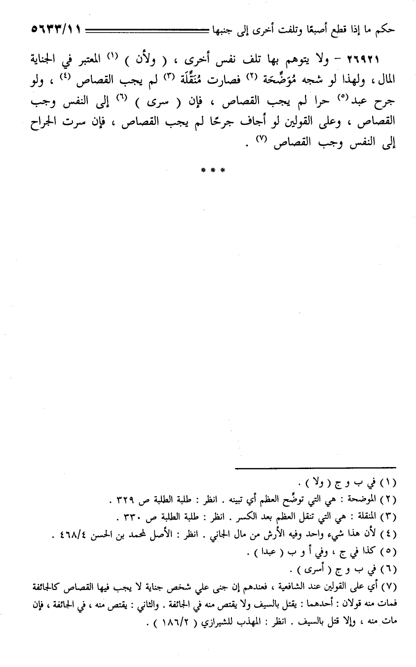 26921 - ولا يتوهم بها تلف نفس أخرى، (ولأن) المعتبر في الجناية المال، ولهذا لو شجه موضحة فصارت منقلة لم يجب القصاص، ولو جرح عبد حرا لم يجب القصاص، فإن (سرى) إلى النفس وجب القصاص، وعلى القولين لو أجاف جرحًا لم يجب القصاص، فإن سرت الجراح إلى النفس وجب القصاص.