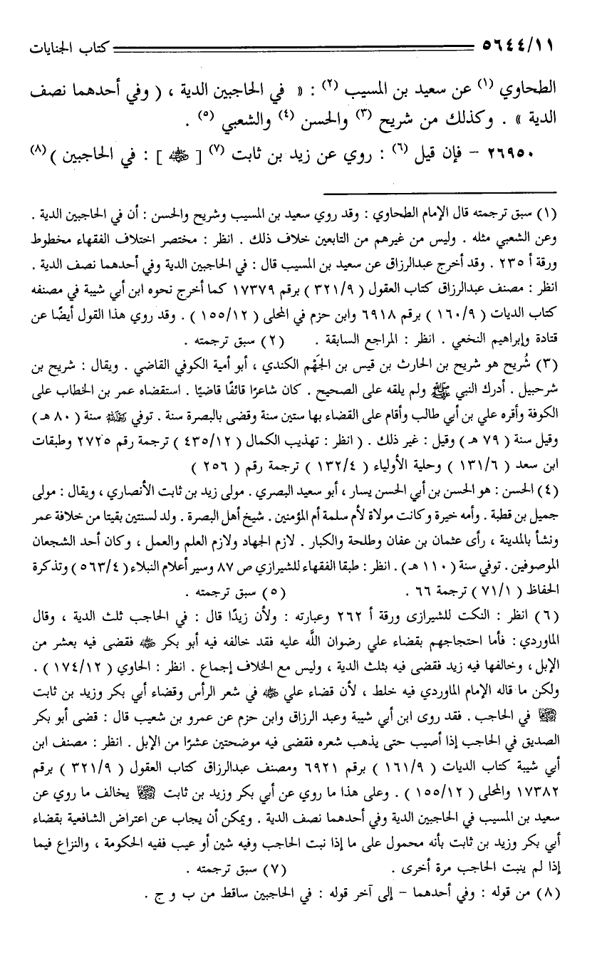 الطحاوي عن سعيد بن المسيب: (في الحاجبين الدية، (وفي أحدهما نصف الدية). وكذلك من شريح والحسن والشعبي.