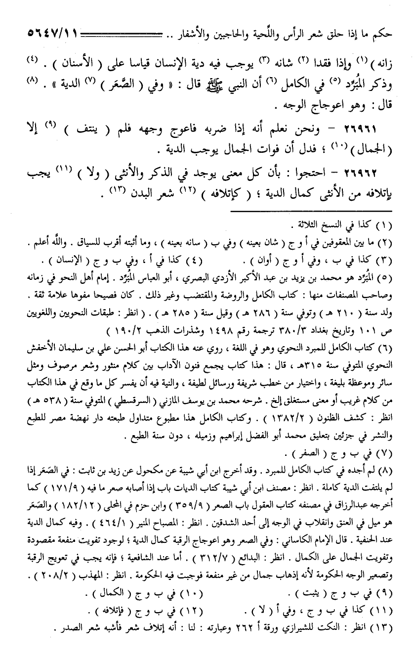 26962 - احتجوا: بأن كل معنى يوجد في الذكر والأنثى (ولا) يجب بإتلافه من الأنثى كمال الدية، (كإتلافه) شعر البدن.