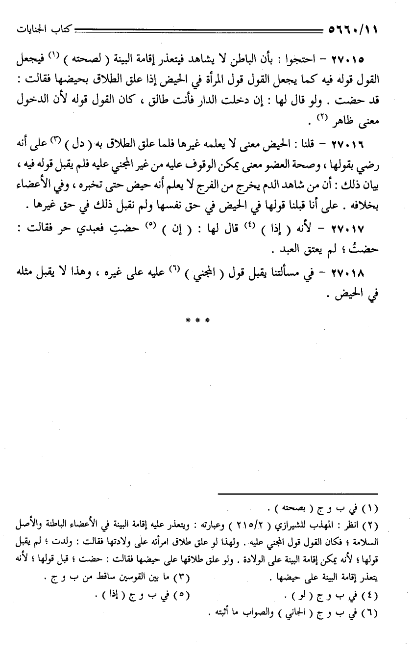 27016 - قلنا: الحيض معنى لا يعلمه غيرها فلما علق الطلاق به (دل) على أنه رضي بقولها، وصحة العضو معنى يمكن الوقوف عليه من غير المجني عليه فلم يقبل قوله فيه، بيان ذلك، أن من شاهد الدم يخرج من الفرج لا يعلم أنه حيض حتى تخبره، وفي الأعضاء بخلافه. على أنا قبلنا في الحيض في حق نفسها ولم تقبل ذلك في حق غيرها.