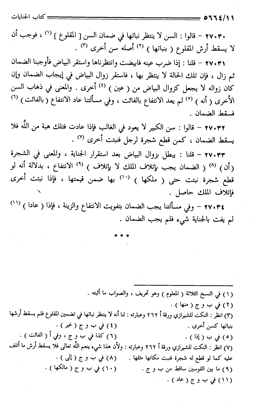 27033 - قلنا: يبطل بزوال البياض بعد استقرار الجناية، والمعنى في الشجرة (أن) (الضمان يجب بإتلاف الملك لا بإتلاف) الانتفاع، بدلالة أنه لو قطع شجرة نبتت حتى (ملكها) بها ضمن قيمتها، فإذا نبتت أخرى فإتلاف الملك حاصل.