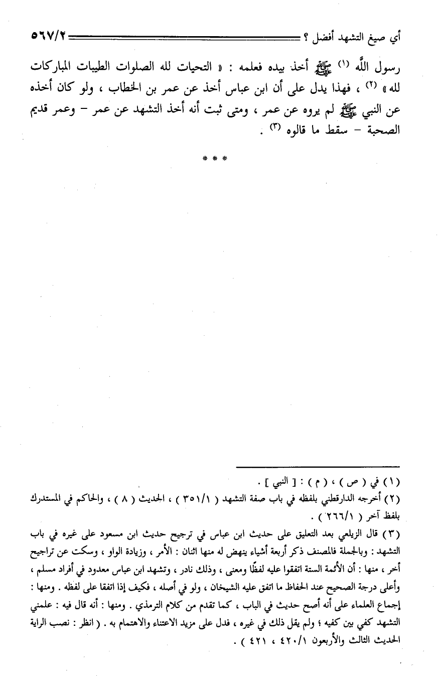 رسول الله - صلى الله عليه وسلم - أخذ بيده فعلمه: (التحيات لله الصلوات الطيبات المباركات لله)، فهذا يدل على أن ابن عباس أخذ عن عمر بن الخطاب، ولو كان أخذه عن النبي - صلى الله عليه وسلم - لم يروه عن عمر، ومتى ثبت أنه أخذ التشهد عن عمر- وعمر قديم الصحبة- سقط ما قالوه.