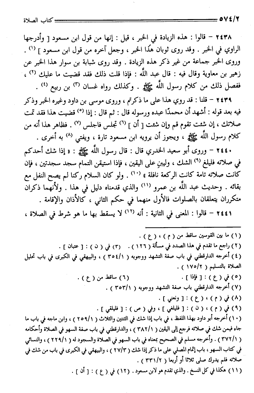 2440 - وروى أبو سعيد الخدري قال: قال رسول الله - صلى الله عليه وسلم -: (إذا شك أحدكم في صلاته فليلغ الشك، وليبن على اليقين، فإذا استيقن التمام سجد سجدتين، فإن كانت صلاته تامة كانت الركعة نافلة). ولو كان السلام ركنا لم يصح النفل مع بقائه. وحديث عبد الله بن عمرو والذي قدمناه دليل في هذا. ولأنهما ذكران متكرران يتعلقان بالصلوات فالأول منهما في حكم الثاني، كالأذان والإقامة.