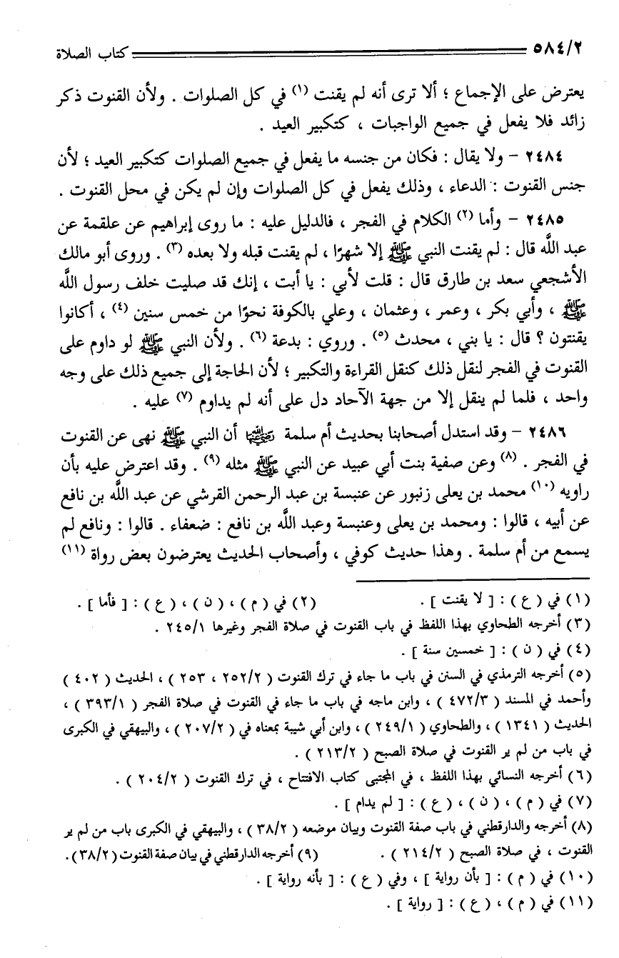 2485 - وأما الكلام في الفجر، فالدليل عليه: ما روى إبراهيم عن علقمة عن عبد الله قال: لم يقنت النبي - صلى الله عليه وسلم - إلا شهرا، لم يقنت قبله ولا بعده. وروى أبو مالك الأشجعي سعد بن طارق قال: قلت لأبي: يا أبت، إنك قد صليت خلف رسول الله - صلى الله عليه وسلم -، وأبي بكر، وعمر، وعثمان، وعلي بالكوفة نحوا من خمس سنين، أكانوا يقنتون؟ قال: يا بني، محدث. وروي: بدعة. ولأن النبي - صلى الله عليه وسلم - لو داوم على القنوت في الفجر لنقل ذلك كنقل القراءة والتكبير؛ لأن الحاجة إلى جميع ذلك على وجه واحد، فلما لم ينقل إلا من جهة الآحاد دل على أنه لم يداوم عليه.