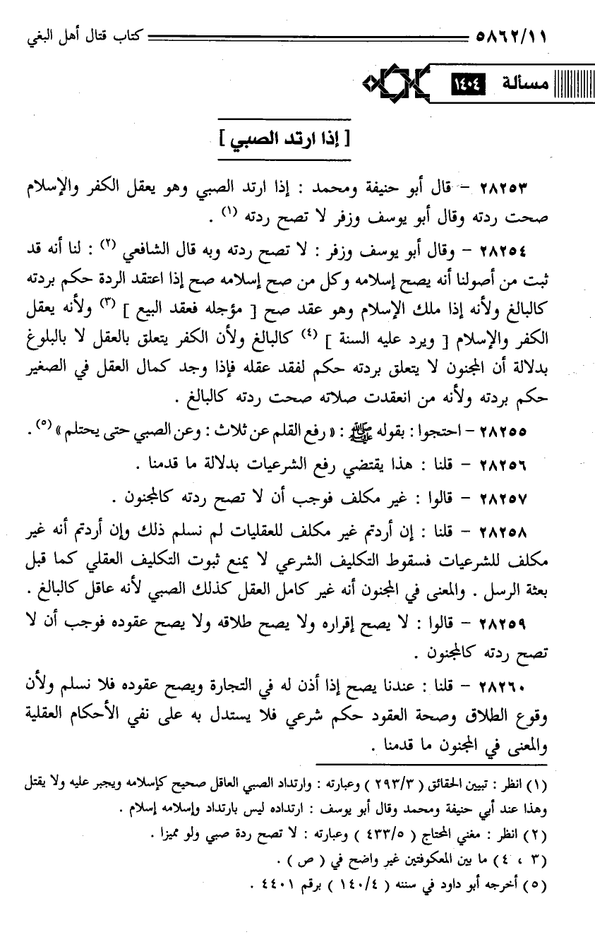 28254 - وقال أبو يوسف وزفر: لا تصح ردته وبه قال الشافعي: لنا أنه قد ثبت من أصولنا أنه يصح إسلامه وكل من صح إسلامه صح إذا اعتقد الردة حكم بردته كالبالغ ولأنه إذا ملك الإسلام وهو عقد صح [مؤجله فعقد البيع] ولأنه يعقل الكفر والإسلام [ويرد عليه السنة] كالبالغ ولأن الكفر يتعلق بالعقل لا بالبلوغ بدلالة أن المجنون لا يتعلق بردته حكم لفقد عقله فإذا وجد كمال العقل في الصغير حكم بردته ولأنه من انعقدت صلاته صحت ردته كالبالغ.