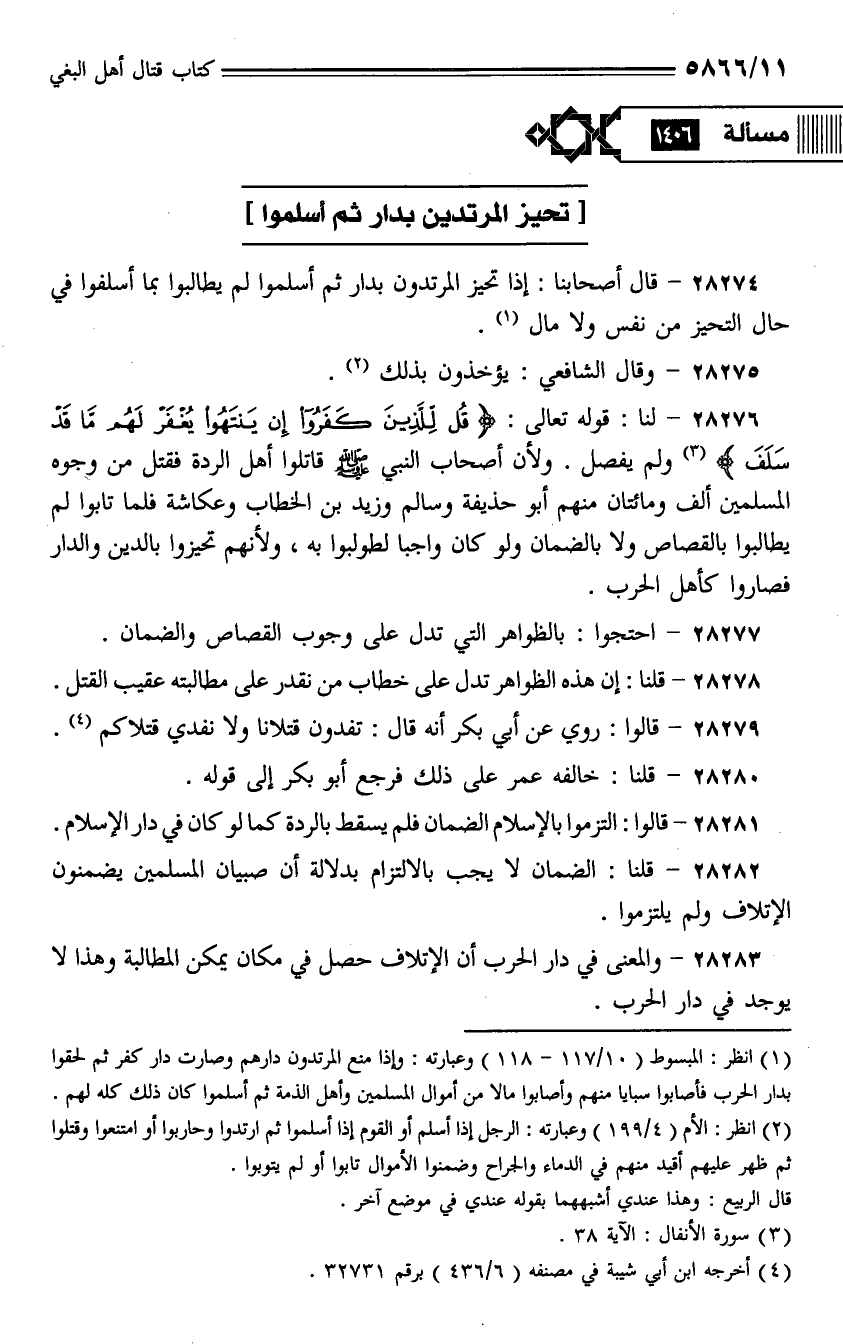 28276 - لنا: قوله تعالى: {قل للذين كفروا إن ينتهوا يغفر لهم ما قد سلف} ولم يفصل. ولأن أصحاب النبي - صلى الله عليه وسلم - قاتلوا أهل الردة فقتل من وجوه المسلمين ألف ومائتان منهم أبو حذيفة وسالم وزيد بن الخطاب وعكاشة فلما تابوا لم يطالبوا بالقصاص ولا بالضمان ولو كان واجبا لطولبوا به، ولأنهم تحيزوا بالدين والدار فصاروا كأهل الحرب.