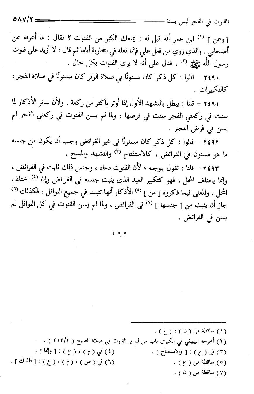 2491 - قلنا: يبطل بالتشهد الأول إذا أوتر بأكثر من ركعة. ولأن سائر الأذكار لما سنت في ركعتي الفجر سنت في فرضها، ولما لم يسن القنوت في ركعتي الفجر لم يسن في فرض الفجر.