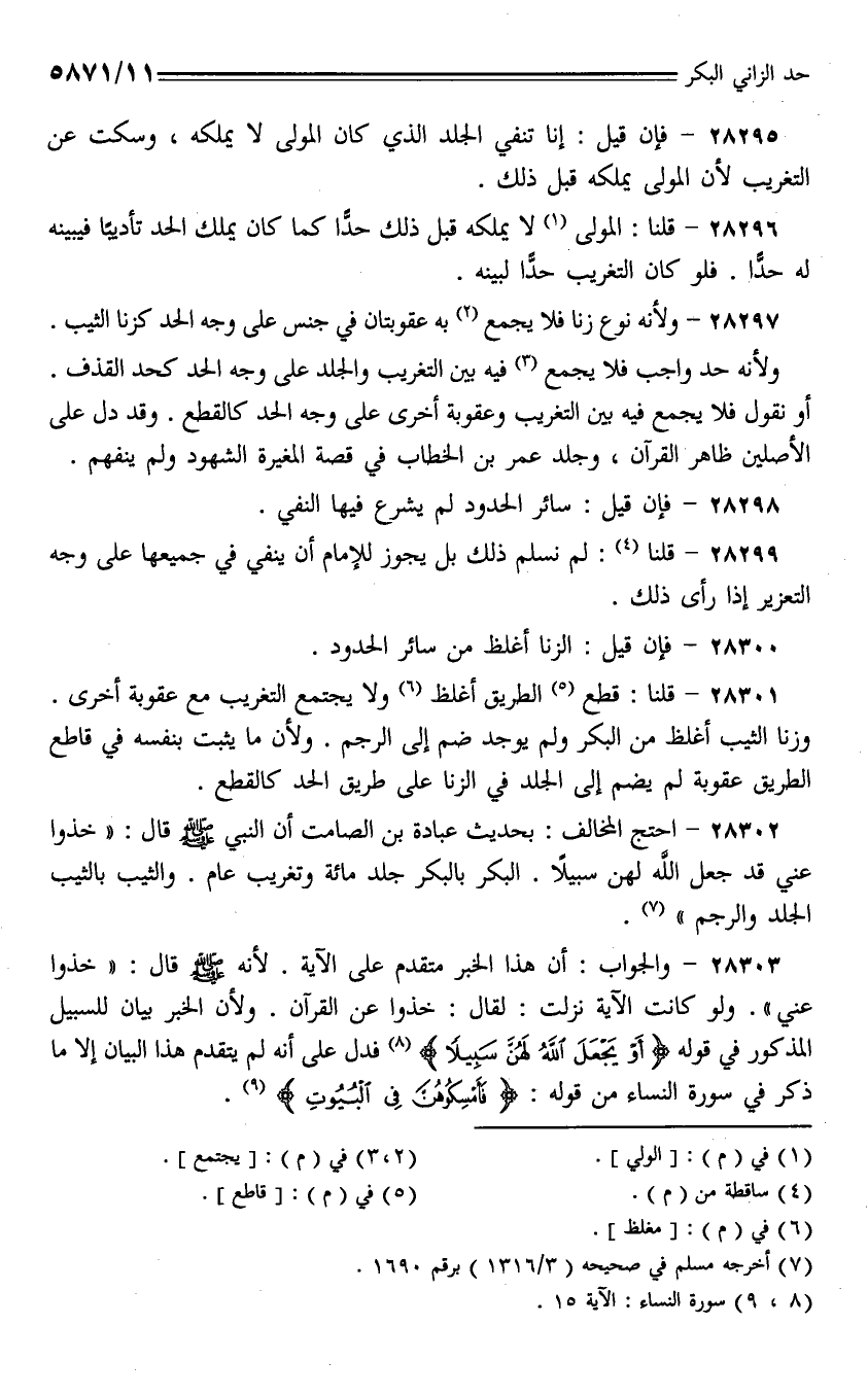 28301 - قلنا: قطع الطريق أغلظ ولا يجتمع التغريب مع عقوبة أخرى. وزنا الثيب أغلظ من البكر ولم يوجد ضم إلى الرجم. ولأن ما يثبت بنفسه في قاطع الطريق عقوبة لم يضم إلى الجلد في الزنا على طريق الحد كالقطع.