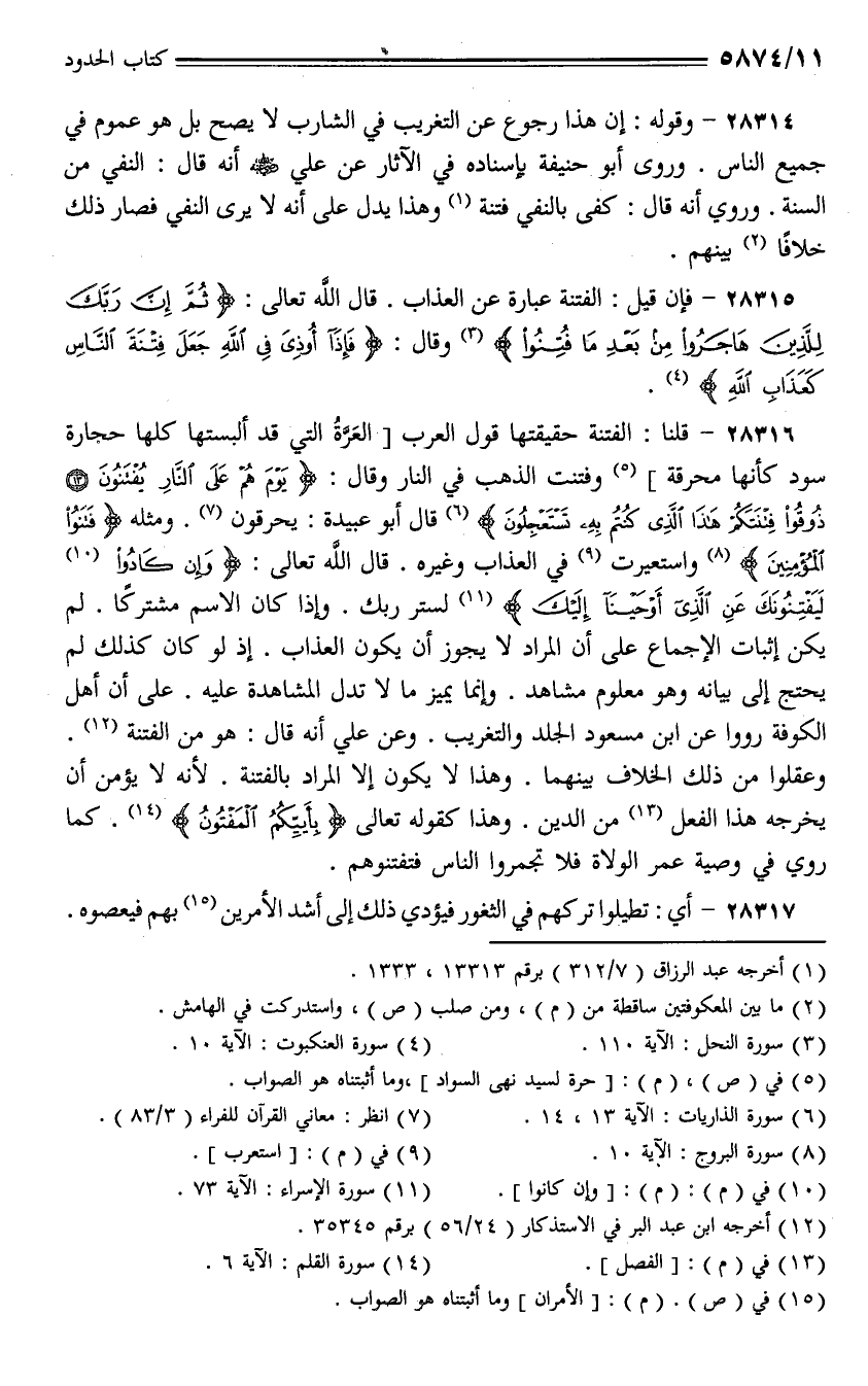 28316 - قلنا: الفتنة حقيقتها قول العرب [العرة التي قد ألبستها كلها حجارة سود كأنها محرقة] وفتنت الذهب في النار وقال: {يوم هم على النار يفتنون * ذوقوا فتنتكم هذا الذي كنتم به تستعجلون} قال أبو عبيدة: يحرقون. ومثله {فتنوا المؤمنين} واستعيرت في العذاب وغيره. قال الله تعالى: {وإن كادوا * ليفتنونك عن الذي أوحينا إليك} لستر ربك. وإذا كان الاسم مشتركًا. لم يكن إثبات الإجماع على أن المراد لا يجوز أن يكون العذاب. إذ لو كان كذلك لم يحتج إلى بيانه وهو معلوم مشاهد. وإنما يميز ما لا تدل المشاهدة عليه. على أن أهل الكوفة رووا عن ابن مسعود الجلد والتغريب. وعن علي أنه قال: هو من الفتنة. وعقلوا من ذلك الخلاف بينهما. وهذا لا يكون إلا المراد بالفتنة. لأنه لا يؤمن أن يخرجه هذا الفعل من الدين. وهذا كقوله تعالى {بأييكم المفتون]. كما روي في وصية عمر الولاة فلا تجمروا الناس فتفتنوهم.