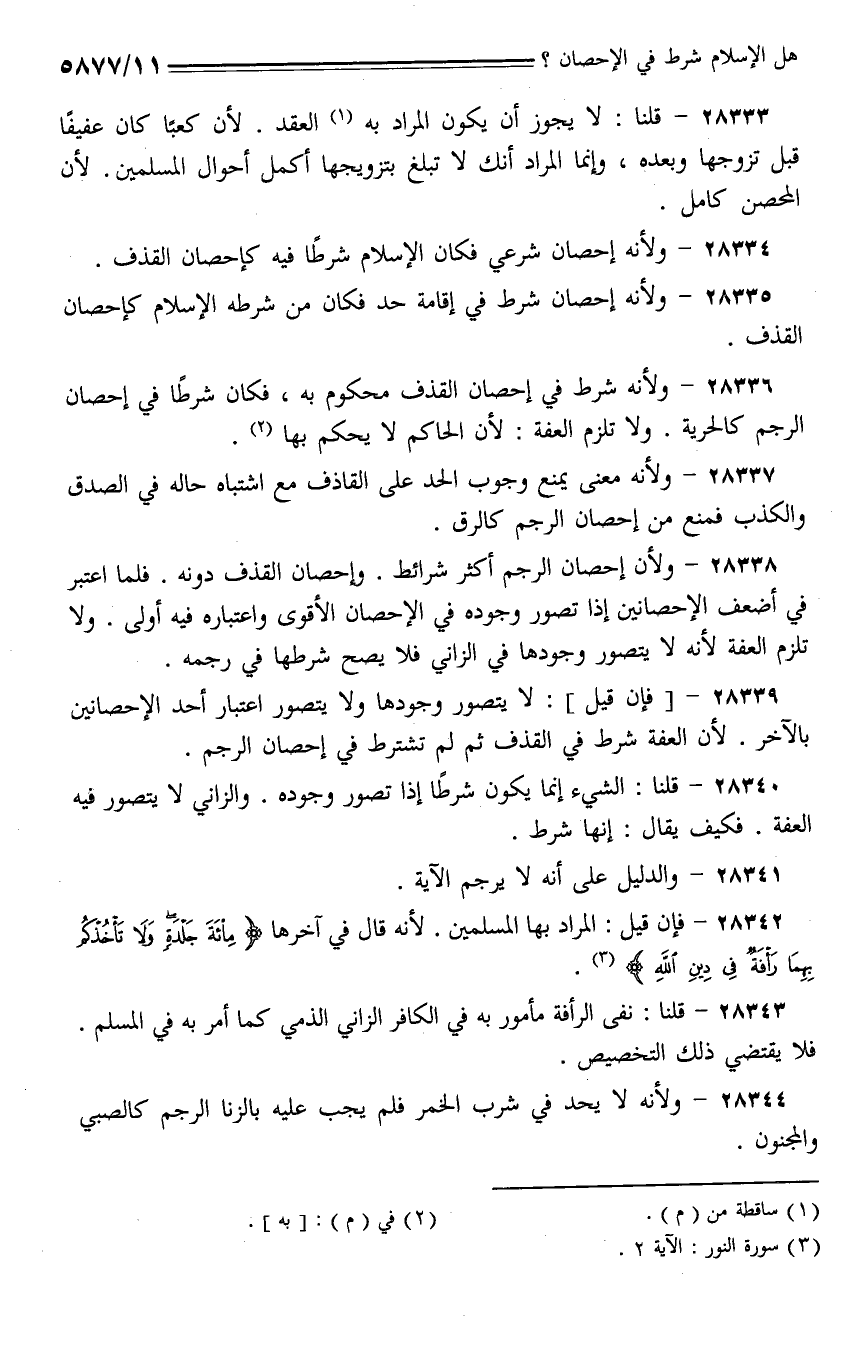 28337 - ولأنه معنى يمنع وجوب الحد على القاذف مع اشتباه حاله في الصدق والكذب فمنع من إحصان الرجم كالرق.