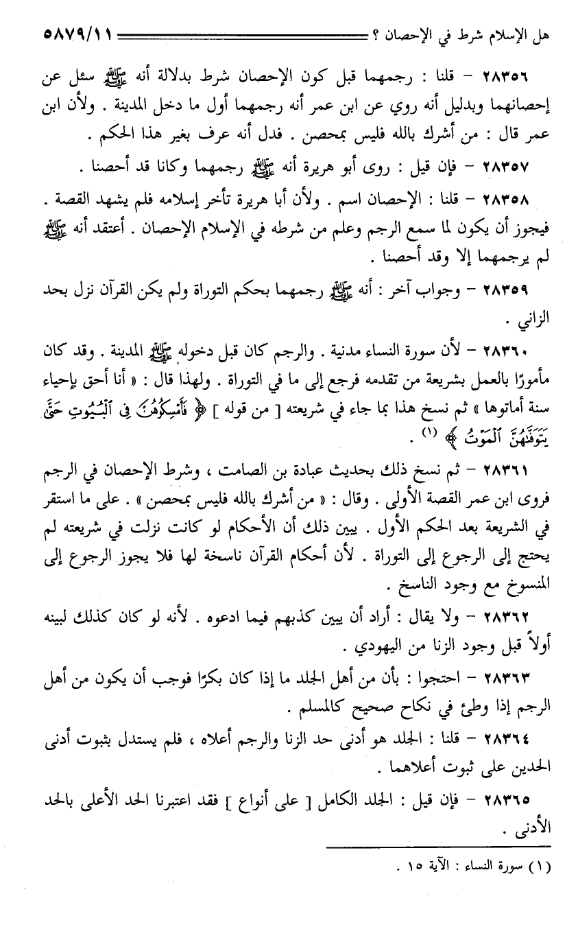 28358 - قلنا: الإحصان اسم. ولأن أبا هريرة تأخر إسلامه فلم يشهد القصة. فيجوز أن يكون لما سمع الرجم وعلم من شرطه في الإسلام الإحصان. أعتقد أنه - صلى الله عليه وسلم - لم يرجمهما إلا وقد أحصنا.