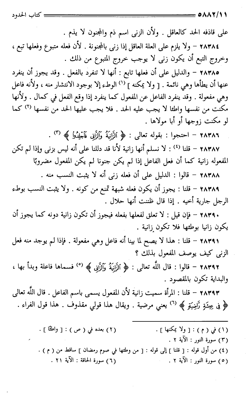 28387 - قلنا: لا نسلم أنها زانية لأنا قد دللنا على أنه ليس بزنى وإذا لم تكن المفعوله زانية كما أن فعل الفاعل إذا لم يكن جنونا لم يكن المفعول مضروبًا.