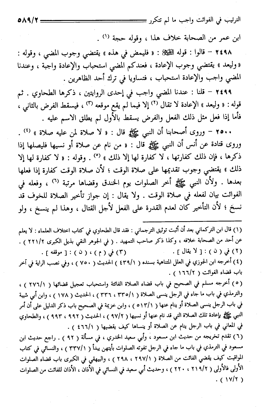2500 - وروى أصحابنا أن النبي - صلى الله عليه وسلم - قال: (لا صلاة لمن عليه صلاة). وروى قتادة عن أنس أن النبي - صلى الله عليه وسلم - قال: (من نام عن صلاة أو نسيها فليصلها إذا ذكرها، فإن ذلك كفارتها، لا كفارة لها إلا ذلك). وقوله: (لا كفارة لها إلا ذلك) يقتضي وجوب تقديمها على صلاة الوقت؛ لأن صلاة الوقت كفارة إذا فعلها بعدها. ولأن النبي - صلى الله عليه وسلم - أخر الصوات يوم الخندق وقضاها مرتبة، وفعله في الفوائت ببيان لفعله في صلاة الوقت. ولا يقال: إن جواز تأخير الصلاة للخوف قد نسخ؛ لأن التأخير كان لعدم القدرة على الفعل لأجل القتال، وهذا لم ينسخ، ولو