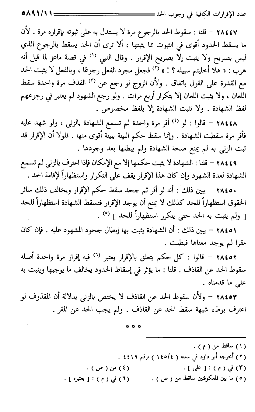 28452 - قالوا: كل حكم يتعلق بالإقرار يعتبر فيه إقرار مرة واحدة أصله سقوط الحد عن القاذف. قلنا: ما يؤثر في إسقاط الحدود يخالف ما يوجبها ويثبت به على ما قدمناه.