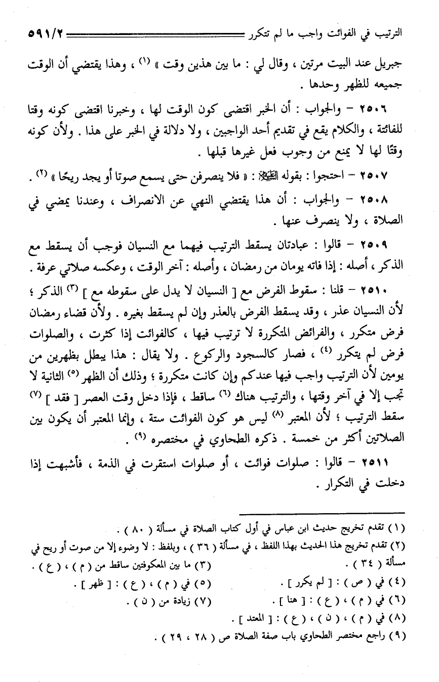 2510 - قلنا: سقوط الفرض مع [النسيان لا يدل على سقوطه مع] الذكر؛ لأن النسيان عذر، وقد يسقط الفرض بالعذر وإن لم يسقط بغيره. ولأن قضاء رمضان فرض متكرر، والفرائض المتكررة لا ترتيب فيها، كالفوائت إذا كثرت، والصلوات فرض لم يتكرر، فصار كالسجود والركوع. ولا يقال: هذا يبطل بظهرين من يومين لأن الترتيب واجب فيها عندكم وإن كانت متكررة؛ وذلك أن الظهر الثانية لا تجب إلا في آخر وقتها، والترتيب هناك ساقط، فإذا دخل وقت العصر [فقد] سقط الترتيب؛ لأن المعتبر ليس هو كون الفوائت ستة، وإنما المعتبر أن يكون بين الصلاتين أكثر من خمسة. ذكره الطحاوي في مختصره.