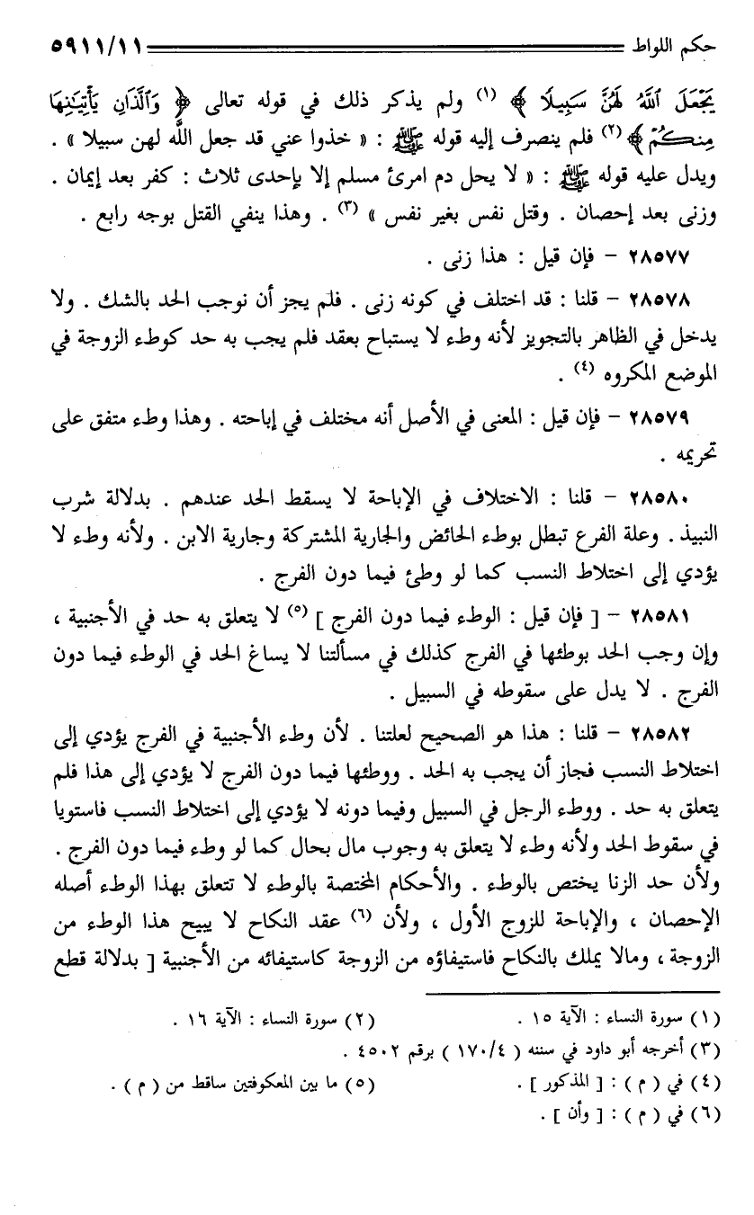 28581 - [فإن قيل: الوطء فيما دون الفرج] لا يتعلق به حد في الأجنبية، وإن وجب الحد بوطئها في الفرج كذلك في مسألتنا لا يساغ الحد في الوطء فيما دون الفرج. لا يدل على سقوطه في السبيل.