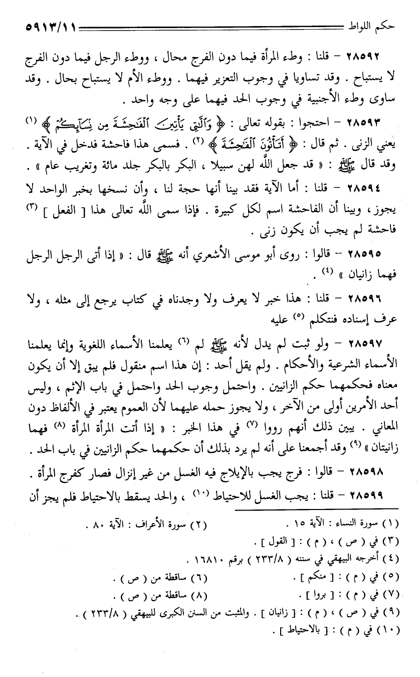 28593 - احتجوا: بقوله تعالى: {والآتي يأتين الفاحشة من نسائكم} يعنى الزنى. ثم قال: {أتأتون الفاحشة}. فسمى هذا فاحشة فدخل في الآية. وقد قال - صلى الله عليه وسلم -: (قد جعل الله لهن سبيلا، البكر بالبكر جلد مائة وتغريب عام).