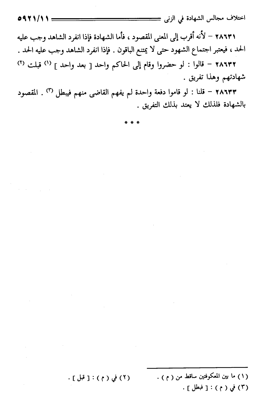28633 - قلنا: لو قاموا دفعة واحدة لم يفهم القاضي منهم فيبطل. المقصود بالشهادة فلذلك لا يعتد بذلك التفريق.