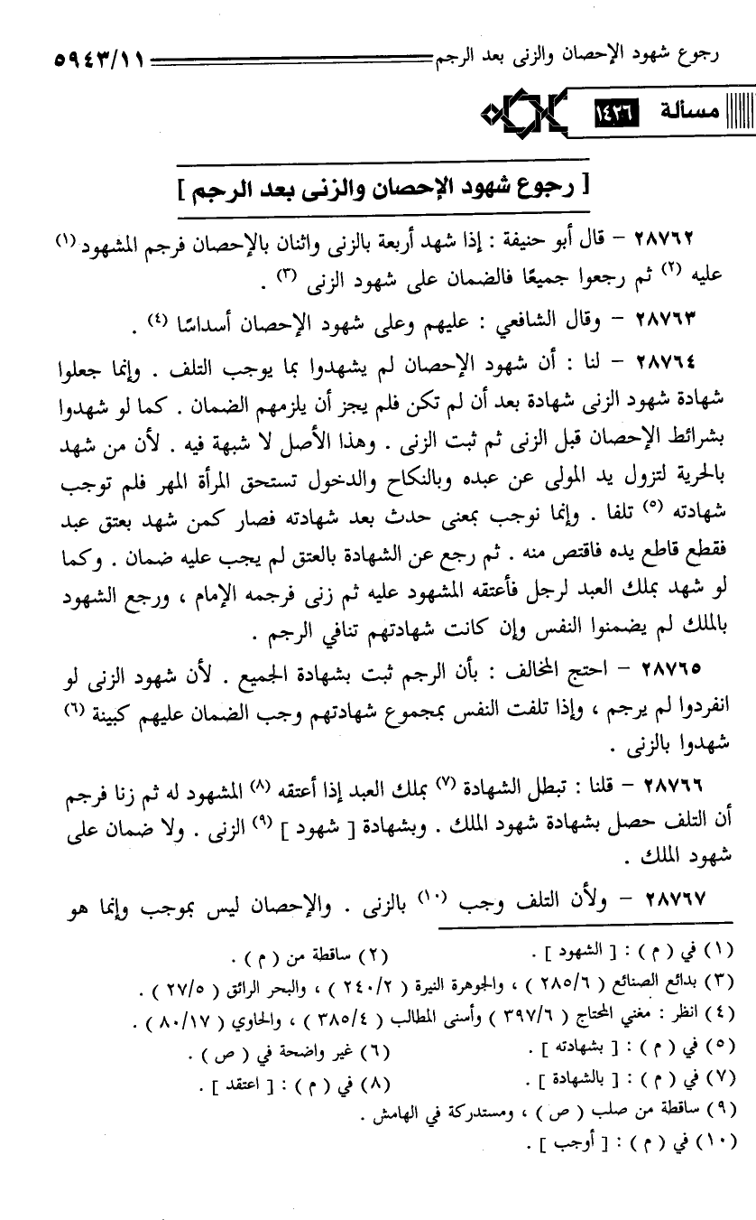 28766 - قلنا: تبطل الشهادة بملك العبد إذا أعتقه المشهود له ثم زنا فرجم أن التلف حصل بشهادة شهود الملك. وبشهادة [شهود] الزنى. ولا ضمان على شهود الملك