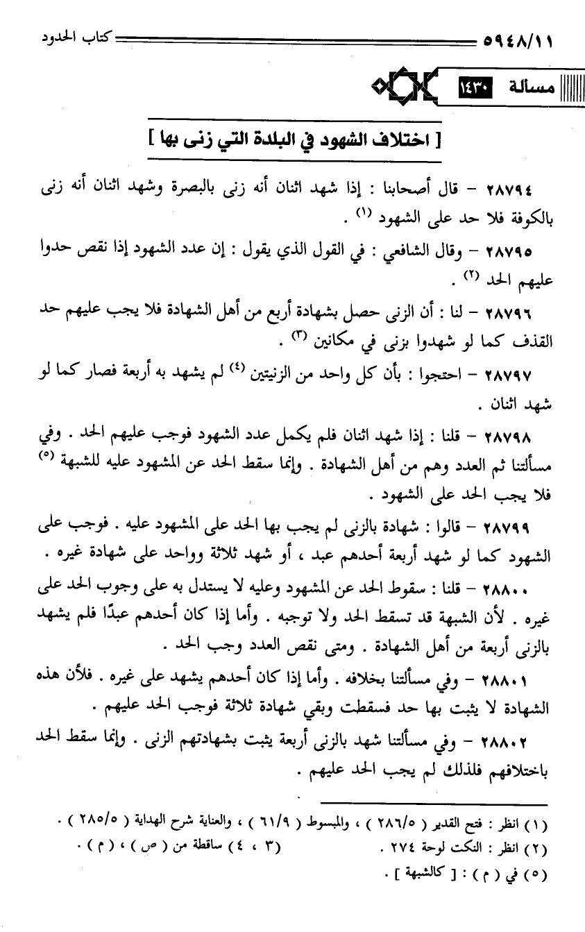 28794 - قال أصحابنا: إذا شهد اثنان أنه زنى بالبصرة وشهد اثنان أنه زنى بالكوفة فلا حد على الشهود.