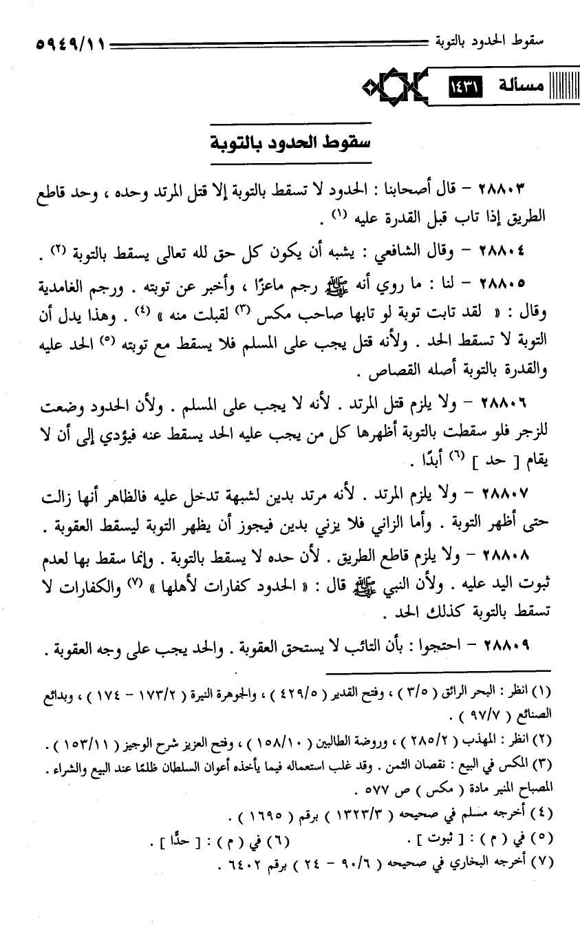 28803 - قال أصحابنا: الحدود لا تسقط بالتوبة إلا قتل المرتد وحده، وحد قاطع الطريق إذا تاب قبل القدرة عليه.