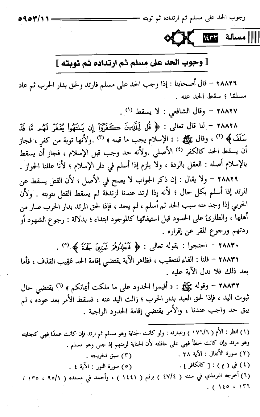 28828 - لنا قال تعالى: {قل للذين كفروا إن ينتهوا يغفر لهم ما قد سلف}، وقال - صلى الله عليه وسلم -: (الإسلام يجب ما قبله). ولأنها توبة من كفر فجاز أن يسقط الحد كالكفر الأصلي. ولأنه حد وجب قبل الإسلام، فجاز أن يسقط بالإسلام أصله: العقل بالردة، ولا يلزم إذا أسلم في دار الإسلام؛ لأنا عللنا الجواز.