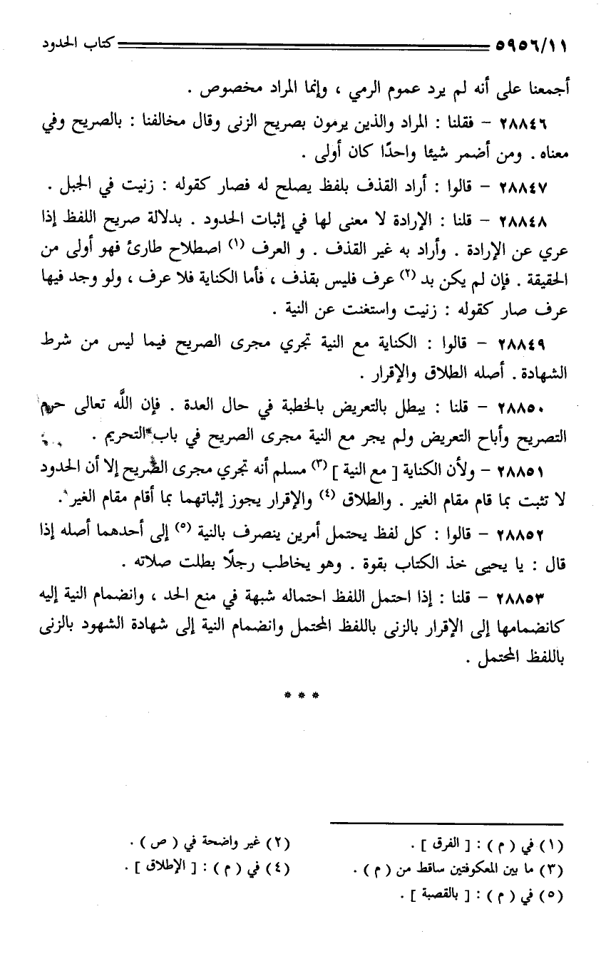 28848 - قلنا: الإرادة لا معنى لها في إثبات الحدود. بدلالة صريح اللفظ إذا عري عن الإرادة. وأراد به غير القذف. والعرف اصطلاح طارئ فهو أولى من الحقيقة. فإن لم يكن بد عرف فليس بقذف، فأما الكناية فلا عرف، ولو وجد فيها عرف صار كقوله: زنيت واستغنت عن النية.