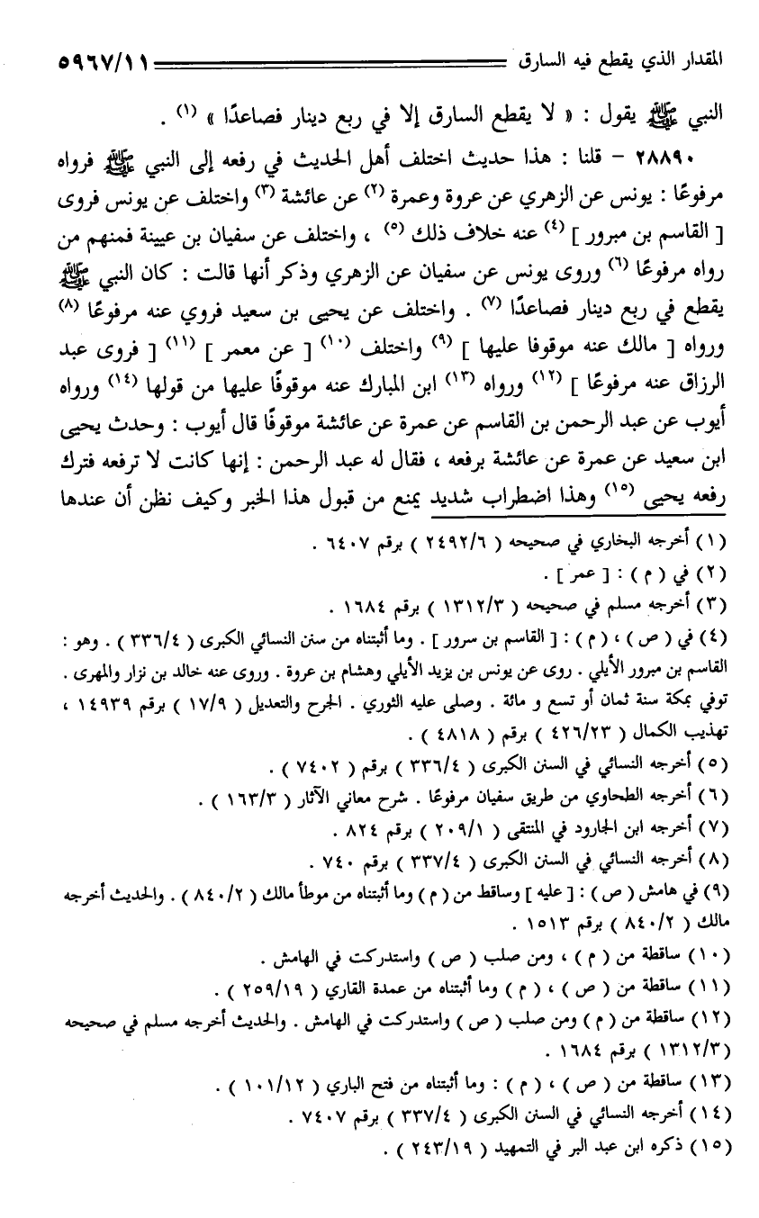 28890 - قلنا: هذا حديث اختلف أهل الحديث في رفعه إلى النبي - صلى الله عليه وسلم - فرواه مرفوعًا: يونس عن الزهري عن عروة وعمرة عن عائشة واختلف عن يونس فروى [القاسم بن مبرور] عنه خلاف ذلك، واختلف عن سفيان بن عيينة فمنهم من رواه مرفوعًا وروى يونس عن سفيان عن الزهري وذكر أنها قالت: كان النبي - صلى الله عليه وسلم - يقطع في ربع دينار فصاعدًا. واختلف عن يحيى بن سعيد فروي عنه مرفوعًا ورواه [مالك عنه موقوفا عليها] واختلف [عن معمر] [فروى عبد الرزاق عنه مرفوعًا] ورواه ابن المبارك عنه موقوفًا عليها من قولها ورواه أيوب عن عبد الرحمن بن القاسم عن عمرة عن عائشة موقوفًا قال أيوب: وحدث يحيى ابن سعيد عن عمرة عن عائشة برفعه، فقال له عبد الرحمن: إنها كانت لا ترفعه فترك رفعه يحى وهذا اضطراب شديد يمنع من قبول هذا الخبر وكيف نظن أن عندها