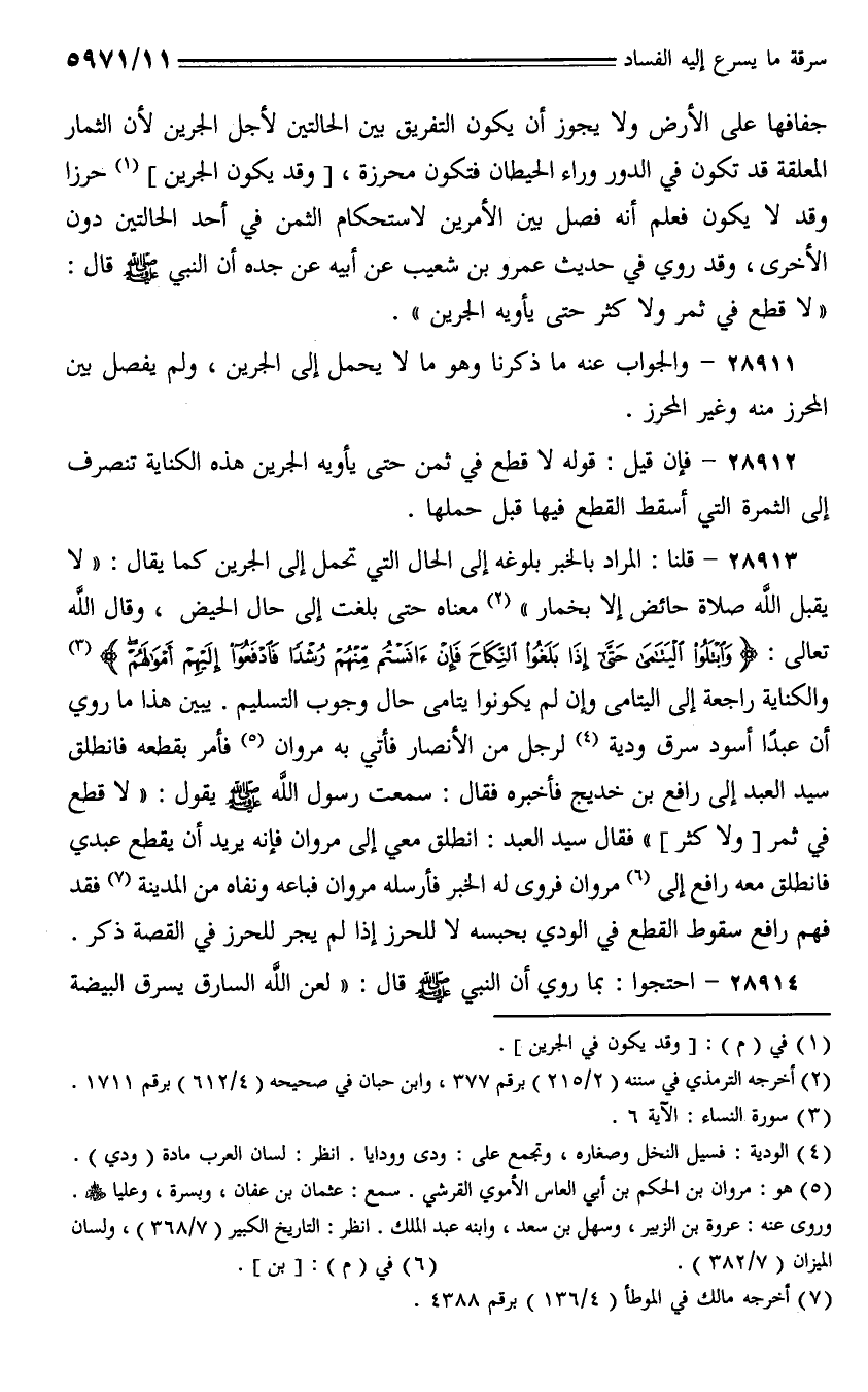 28913 - قلنا: المراد بالخبر بلوغه إلى الحال التي تحمل إلى الجرين كما يقال: (لا يقبل الله صلاة حائض إلا بخمار) معناه حتى بلغت إلى حال الحيض، وقال الله تعالى: {وابتلوا اليتامى حتى إذا بلغوا النكاح فإن أنستم منهم رشدًا فادفعوا إليهم أموالهم} والكناية راجعة إلى اليتامى وإن لم يكونوا يتامى حال وجوب التسليم. يبين هذا ما روي أن عبدًا أسود سرق ودية لرجل من الأنصار فأتى به مروان فأمر بقطعه فانطلق سيد العبد إلى رافع بن خديج فأخبره فقال: سمعت رسول الله - صلى الله عليه وسلم - يقول (لا قطع في ثمر [ولا كثر]) فقال سيد العبد: انطلق معي إلى مروان فباعه ونفاه من المدينة فقد فهم رافع سقوط القطع في الودي بحبسه لا للحرز إذا لم يجر في القصة ذكر.