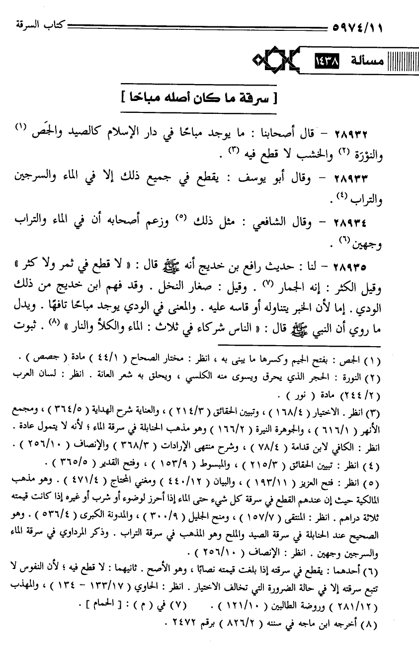 28932 - قال أصحابنا: ما يوجد مباحًا في دار الإسلام كالصيد والجص والنوْرَة والخشب لا قطع فيه.