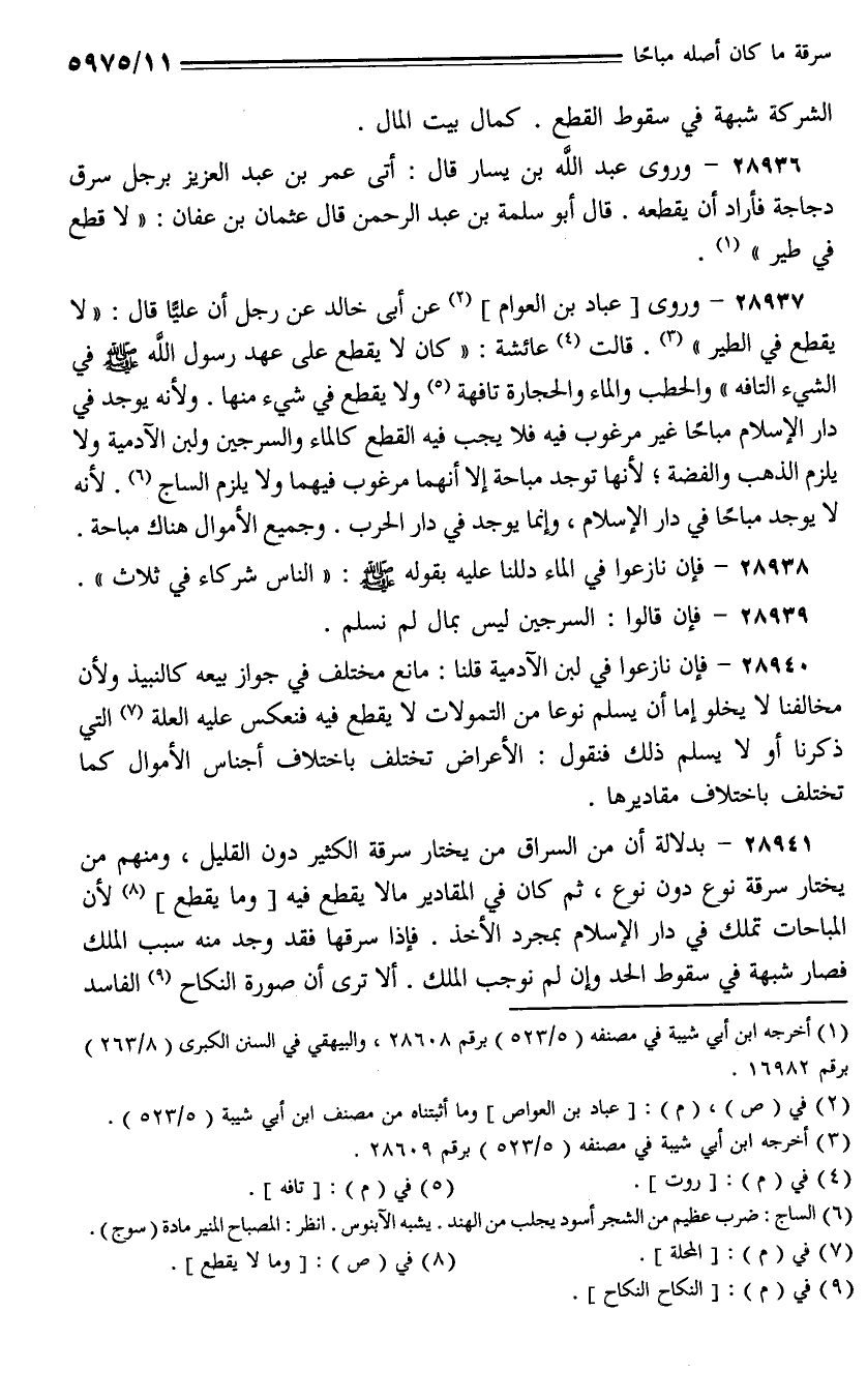 28936 - وروى عبد الله بن يسار قال: أتى عمر بن عبد العزيز برجل سرق دجاجة فأراد أن يقطعه. قال أبو سلمه بن عبد الرحمن قال عثمان بن عفان: (لا قطع في طير).