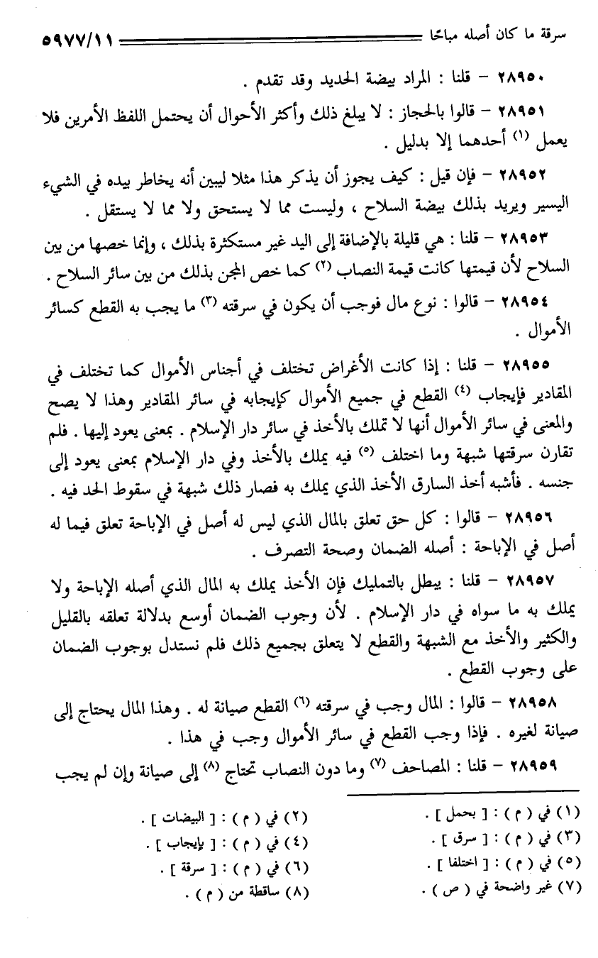 28955 - قلنا: إذا كانت الأغراض تختلف في أجناس الأموال كما تختلف في المقادير فإيجاب القطع في جميع الأموال كإيجابه في سائر المقادير وهذا لا يصح والمعنى في سائر الأموال أنها لا تملك بالأخذ في سائر دار الإسلام. بمعنى يعود إليها. فلم تقارن سرقتها شبهة وما اختلف فيه يملك بالأخذ وفي دار الإسلام بمعنى يعود إلى جنسه. فأشبه أخذ السارق الأخذ الذي يملك به فصار ذلك شبهة في سقوط الحد فيه.
